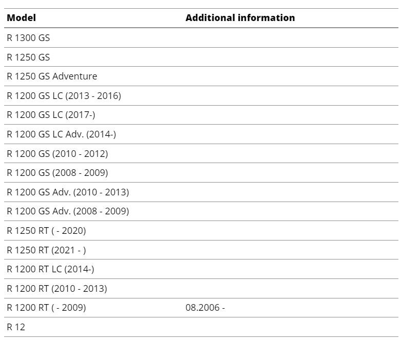 * R1200GS LC (2013~2018), R1200GS ADVENTURE (2014~2018), R1250GS (2019~ ), R1250GS ADVENTURE (2019~ )에 장착 가능합니다.